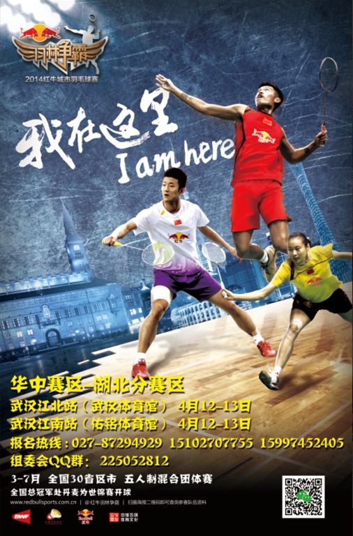 “羽林争霸”2014红牛城市羽毛球赛 竞赛规程(湖北赛区-武汉站) 一、组织机构: 批准单位:国家体育总局乒羽中心 主办单位:湖北省体育赛事管理中心 协办单位:北京红牛饮料销售有限公司湖北分公司 中旭五环体育文化发展有限公司 冠名单位:北京红牛饮料销售有限公司 二、比赛时间、地点: 1、公开报名期:2014年3月20日至各城市赛开赛前一周; 2、参赛队名单公示期: 3月20日至4月4日; 3、比赛时间:4月12日-13日; 4、比赛地点:武汉体育馆(江北赛区) 华师佑铭体育馆(江南赛区) 三、比赛项目: 1、比赛均采用5人制混合团体赛形式,包括:男单、女单、男双和混双; 2、每场比赛的竞赛顺序及说明: 第一局:混双-第一回合(两队的男1和女1) 第二局:男单-第一回合(两队的男2) 第三局:男双-第一回合(两队的男3和男4) 第四局:混双-第二回合(两队的男1和女1) 第五局:男单-第二回合(两队的男2) 第六局:男双-第二回合(两队的男3和男4) 第七局:女单(两队的女1) 四、运动员资格: 1、满18周岁,国籍不限,身体健康,无心脏病、高血压等病史; 2、现役及退役的专业运动员不具备参赛资格。专业运动员指在国家体育总局乒乓球羽毛球运动管理中心及原国家体委注册过的运动员,包括国家队、八一体工队、各省市体工队、各职业俱乐部运动员等; 3、持有中国政府主管部门签发的有效签证或居留许可(外籍选手持有的有效签证或居留许可证件,签发日期应早于2014年3月21日,且有效期在6个月以上的),没有参加过世界羽毛球联合会及五大洲羽毛球联合会组织的比赛,且没有在职业俱乐部(职业俱乐部是指以盈利为目的的企业组织,运动员以训练和比赛为职业并获得工资收入的)效力过的外籍运动员可以参加比赛; 4、运动员报名参赛前须自行购买人身意外伤害保险,且必须与组委会签订免责协议,方可参加比赛; 五、报名须知: 1、不收取任何报名费。 2、每队限报7人(其中包括:领队或教练1人、队员6人,领队和教练在通过运动员资格审查的前提下,也可参加比赛),报名后不能更改; 3、每人限报一支队伍,每队限报一个城市,不得重复报名; 4、参赛队可以以单位名义报名,也可以自由组队报名; 5、符合条件的队伍,可在规定的报名截止日期前,根据赛事官方网站和各地报名平台所发布的报名提示信息,到所在城市进行报名; 6、报名时,队伍负责人须按要求如实填写相关表格; 7、报名时,队伍须提交每位队员的身份证复印件、电子版照片(近期免冠照片,用于参赛证制作)等组委会要求的其他必要证件; 8、各城市赛的冠军,拥有参加大区赛的资格;如获得晋级资格的队伍无法参赛,按名次递补参赛队伍; 9、参加大区赛的队伍,队员名单必须与城市赛阶段一致,不得替换和增补; 10、参赛队员因伤病或其他任何原因不能继续参赛,导致队伍人员减少的情况,如队伍剩余人员大于等于5人,可以完成全部比赛项目时,则可以继续参加比赛,如队伍剩余人员小于5人时,则视为队伍自动弃权; 11、报名地址及联系电话:武昌民主路洪山体育馆南门办公楼五楼(篮球场旁边),联系电话:027-87294929,15997452405,15102707755邮箱361475582@qq.com;2085357194@ qq.com